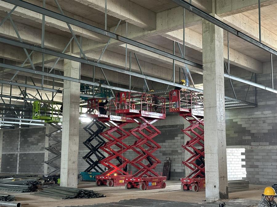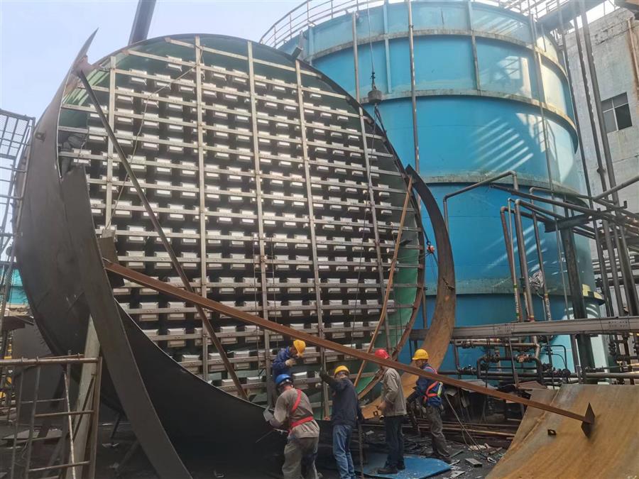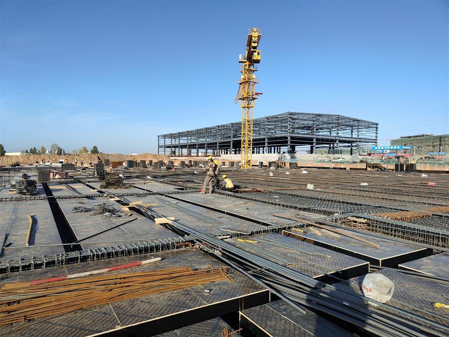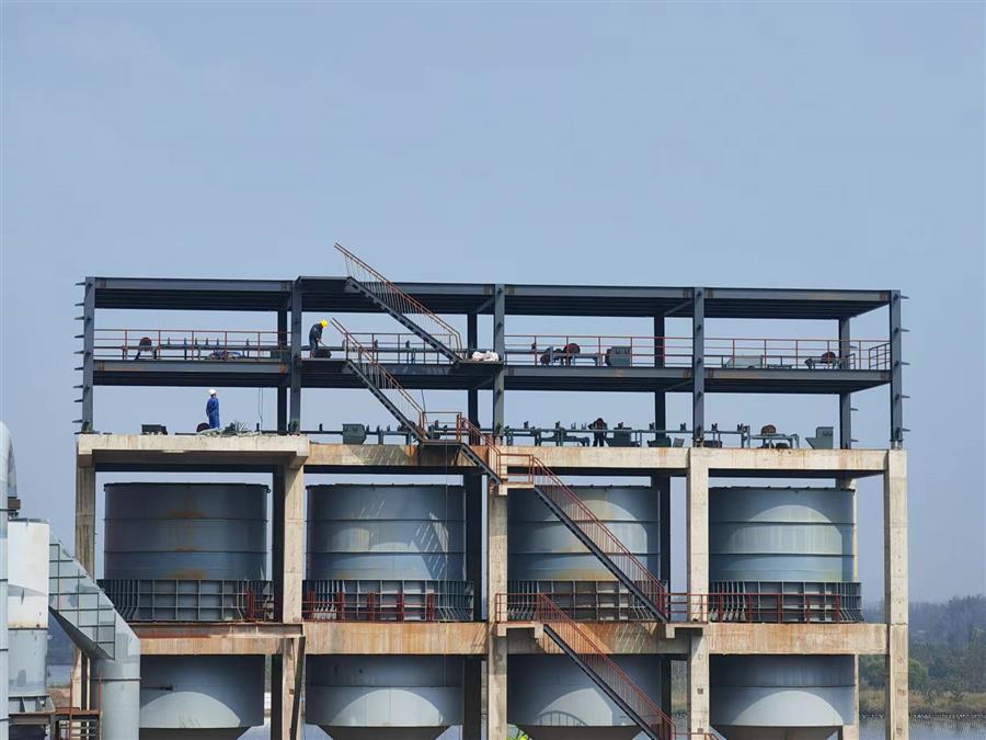 柳鋼環(huán)保公司鋼渣廠中間料場棚化項目之主體工程,工人正在加班開展工作。