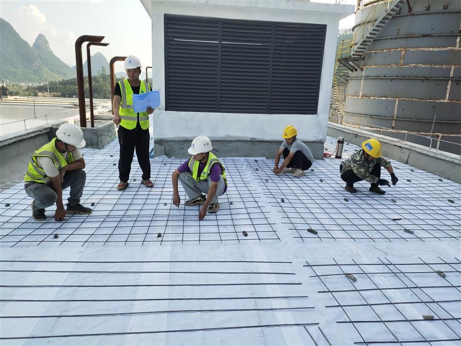 融安縣生活垃圾焚燒發(fā)電項目工程總承包項目,工人正在進(jìn)行汽機(jī)間屋面鋼筋網(wǎng)綁扎。
