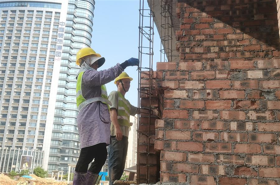 桂中大道東區(qū)地下停車場項目,工人在砌筑墻體。