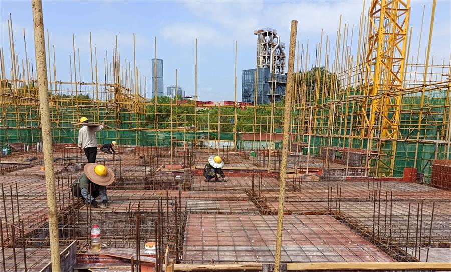 柳州市第三棉紡織廠集資建房項目36#樓、37#樓、38#樓、公廁及垃圾收集點項目,工人正在進(jìn)行綁扎鋼筋和搭設(shè)腳手架。