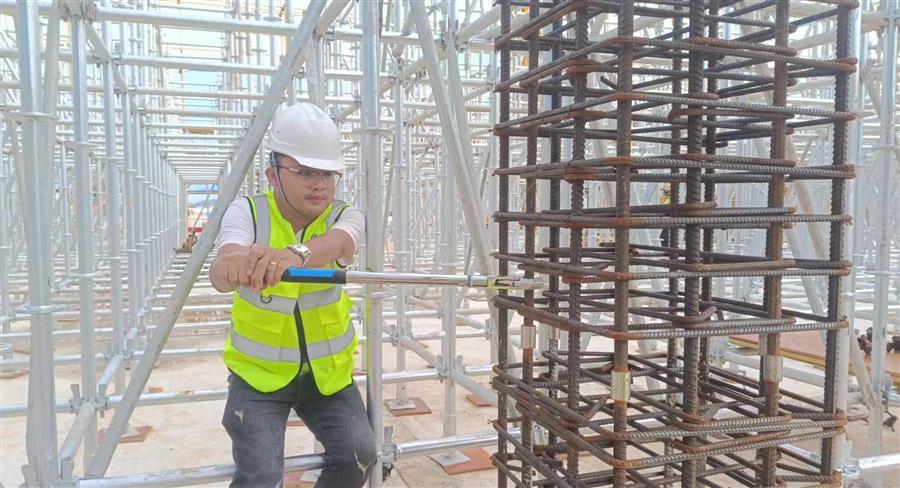 鹿寨智慧林業(yè)零碳循環(huán)產(chǎn)業(yè)園項目,管理人員正在進(jìn)行鋼筋套筒扭矩測試。