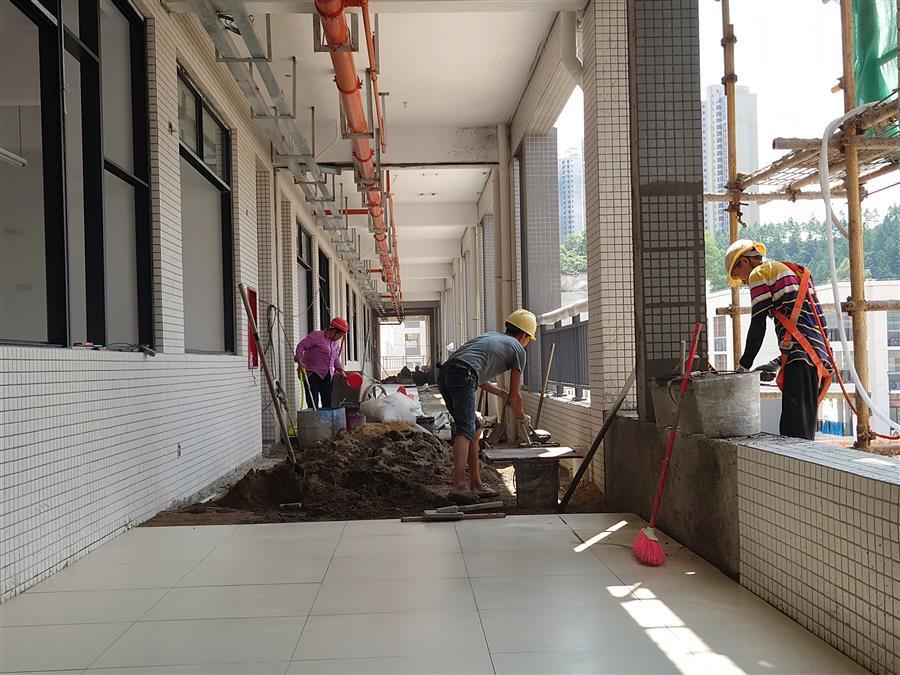 柳州市柳東新區(qū)明德中學(xué)項目,工人正在進(jìn)行4#綜合樓三層水磨石拌合料鋪設(shè)。