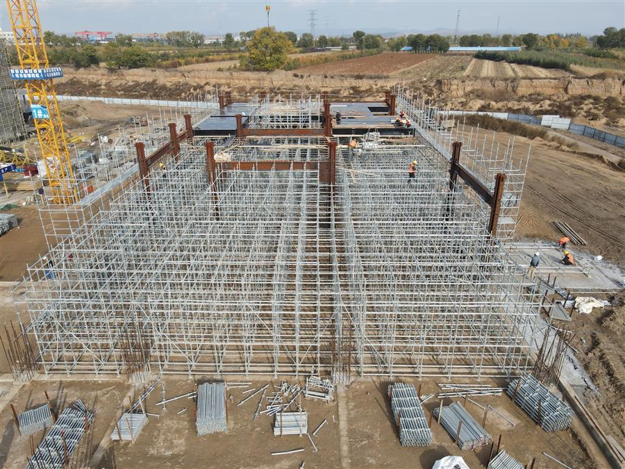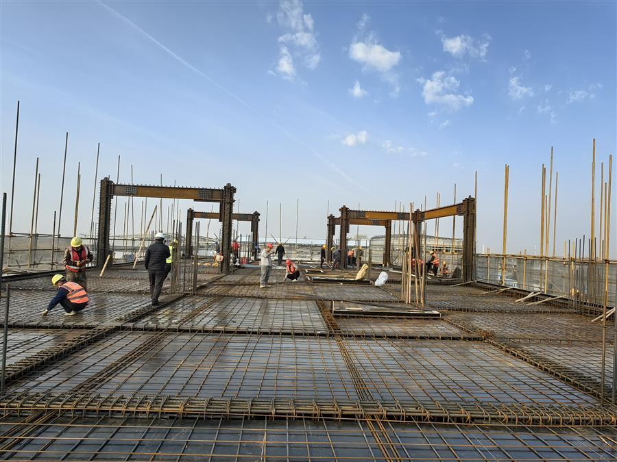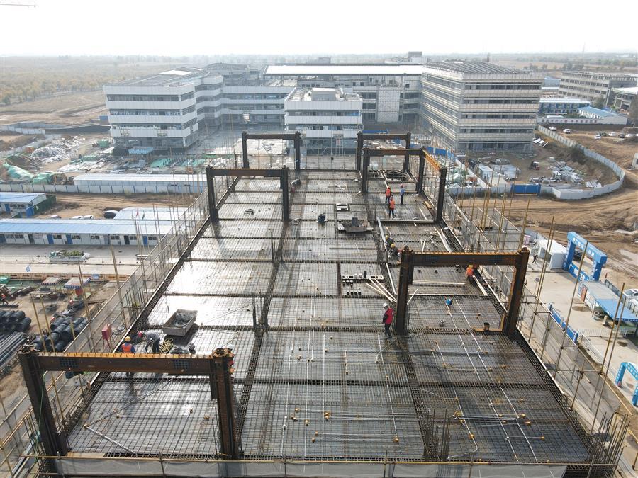 在施工現(xiàn)場,到處可見建筑工人們忙碌的身影,大家分工合作,井然有序地進行病房北樓梁板鋼筋綁扎、水電消防線管預埋、鋼結構吊裝、醫(yī)技區(qū)東段盤扣架搭設、汽車坡道混凝土澆筑等工作面施工,各作業(yè)面協(xié)同推進,現(xiàn)場掀起“大干”熱潮。