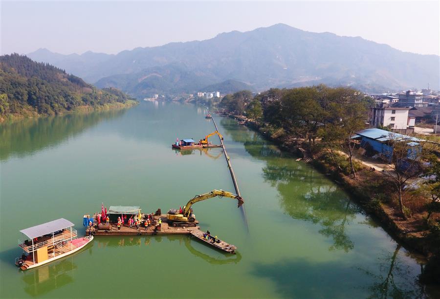 在沉管段施工現(xiàn)場(chǎng),一條超長(zhǎng)輸水管道按照施工方案通過(guò)牽引起重設(shè)備浮運(yùn)至管槽位置附近,猶如巨龍“躺臥”在潯江江面上。隨后,各種機(jī)械設(shè)備相互配合,將管道擺放到位,從下游岸向管道內(nèi)注水讓其緩緩沉入河床預(yù)先挖好的溝槽中,最終順利完成沉管施工。