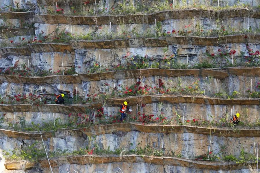 “我們已經(jīng)在山上種下了25萬(wàn)多株各類苗木。”工程項(xiàng)目經(jīng)理陳超宇說,工人們需要先清理有滾落危險(xiǎn)的巖石,然后用鋼筋和混凝土在峭壁上搭建V型板槽,再給開辟出來(lái)的“梯田”回填泥土,并在“田間”鋪設(shè)噴淋系統(tǒng),最后才能進(jìn)行種植。目前種植的苗木有石山紫薇、夾竹桃、石山榕、爬山虎、三角梅、杜鵑等。