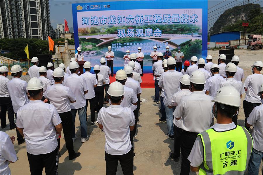 8月1日,冶建公司工程質(zhì)量技術現(xiàn)場觀摩會在桂金分公司施工的河池市龍江六橋(輝樂橋)工程項目舉行。公司總經(jīng)理、黨委副書記蒙勝益,副總經(jīng)理唐峰,副總經(jīng)理、安全總監(jiān)何勇參加。