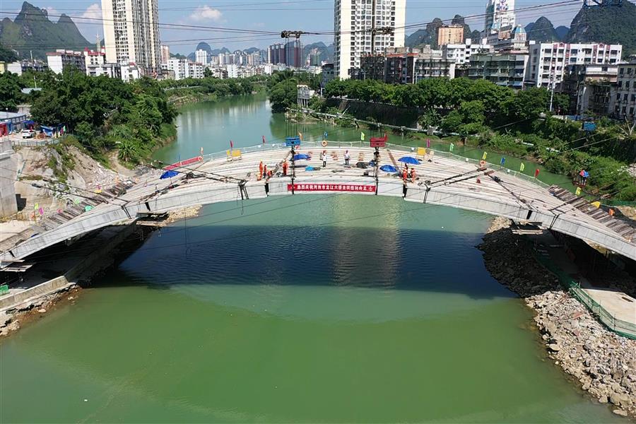 8月3日,隨著最后一節(jié)(第98節(jié))砼拱箱精準吊裝至預(yù)定位置,標志著冶建公司桂金分公司承建的河池市龍江六橋(輝樂橋)順利實現(xiàn)主拱圈全面合龍。公司黨委副書記、紀委書記、工會主席賴海標到現(xiàn)場指導(dǎo)。