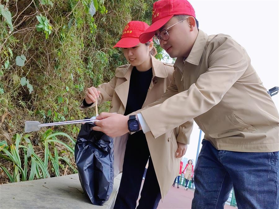 活動中,志愿者們手持垃圾鉗、垃圾袋,沿著環(huán)江濱水步道開展“垃圾清零”活動,仔細(xì)地?fù)焓把匕兜睦?,維護(hù)江堤的環(huán)境衛(wèi)生。