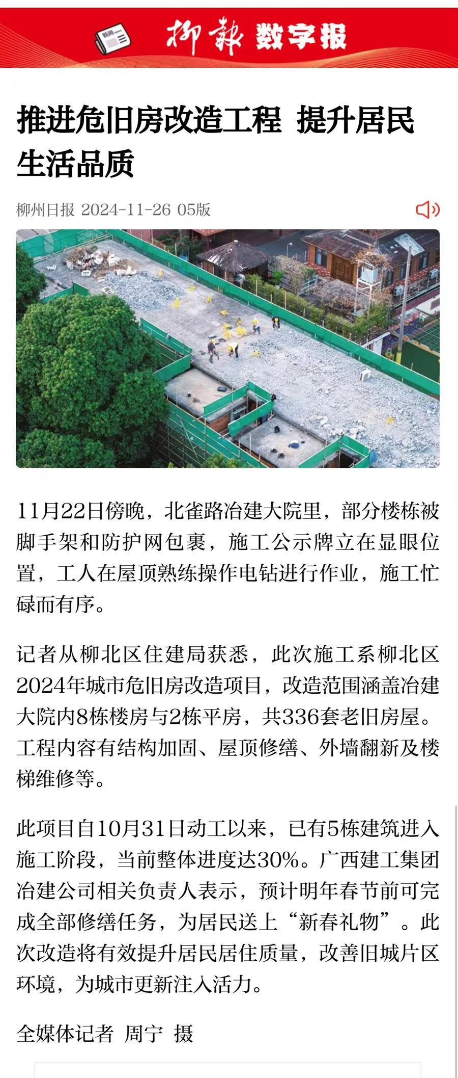 11月25日,《柳州日報》五版以《推進(jìn)危舊房改造工程 提升居民生活品質(zhì)》為題,圖文并茂的形式報道了冶建大院危舊房改造項目順利推進(jìn)的情況。