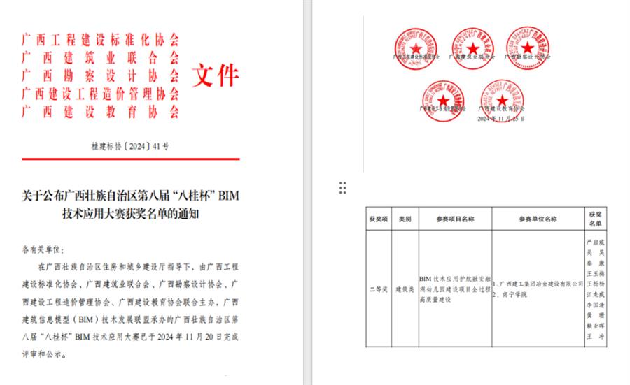 近日,廣西第八屆“八桂杯”BIM技術(shù)應(yīng)用大賽獲獎名單公布,冶建公司基礎(chǔ)分公司申報(bào)的《BIM 技術(shù)應(yīng)用護(hù)航融安融洲幼兒園建設(shè)項(xiàng)目全過程高質(zhì)量建設(shè)》榮獲施工組建筑類二等獎。