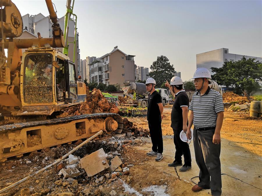 10月5日上午,桂東分公司經(jīng)理謝勇、黨支部書記黃桂軍來(lái)到柳州市防汛抗旱物資儲(chǔ)備倉(cāng)庫(kù)工程項(xiàng)目現(xiàn)場(chǎng)慰問看望節(jié)假日仍堅(jiān)守崗位的一線員工。該項(xiàng)目施工現(xiàn)場(chǎng)地質(zhì)條件復(fù)雜,容易塌孔且地下層部分為巖石層結(jié)構(gòu),施工難度大。為確保在甲方要求的工期內(nèi)完成施工,工人們節(jié)假日仍加班加點(diǎn)搶工期。他們腳踏黃土,頭頂著炎炎烈日,揮灑著蒸騰的汗水,以實(shí)際行動(dòng)為集團(tuán)公司早日躋身世界500強(qiáng)貢獻(xiàn)力量!